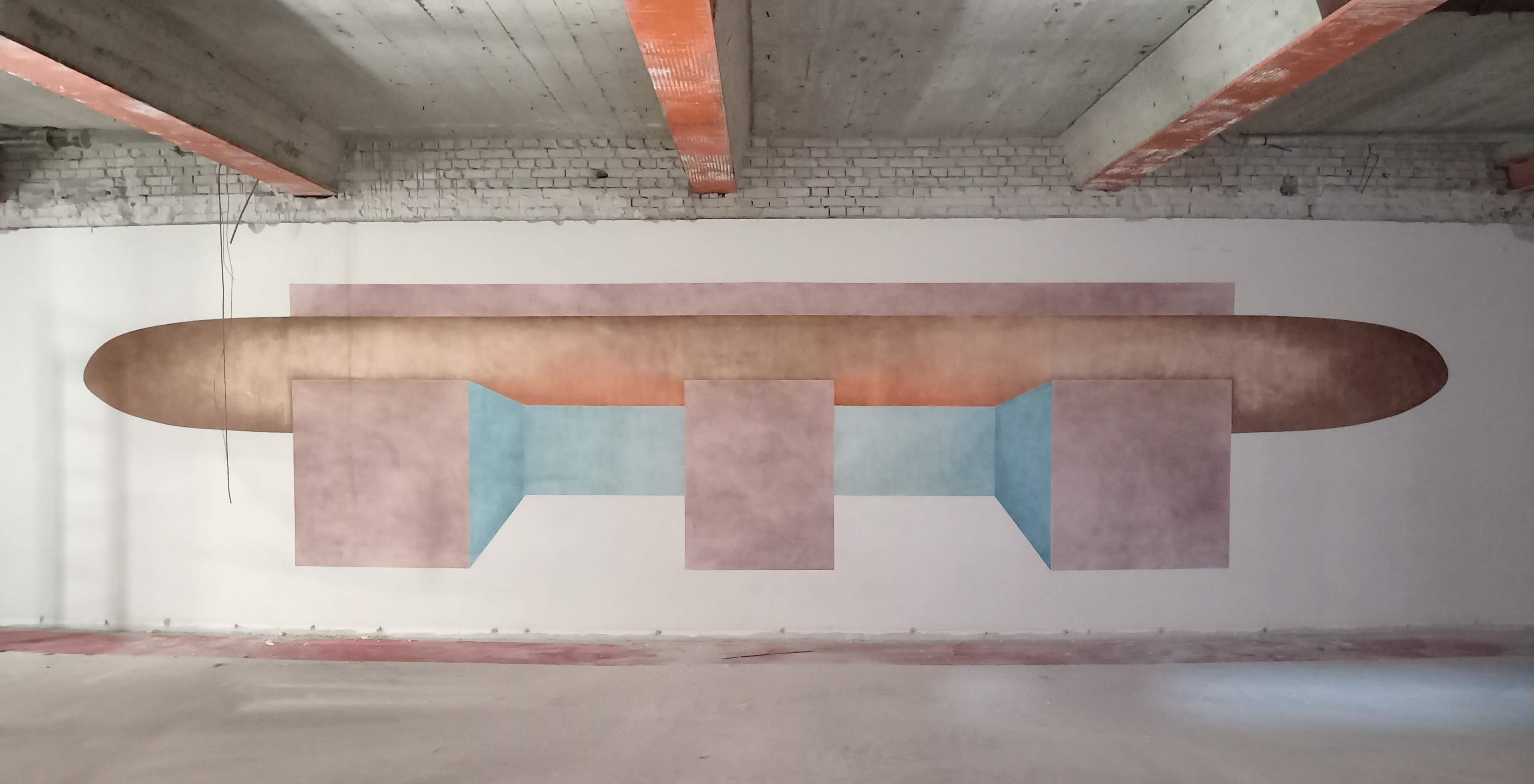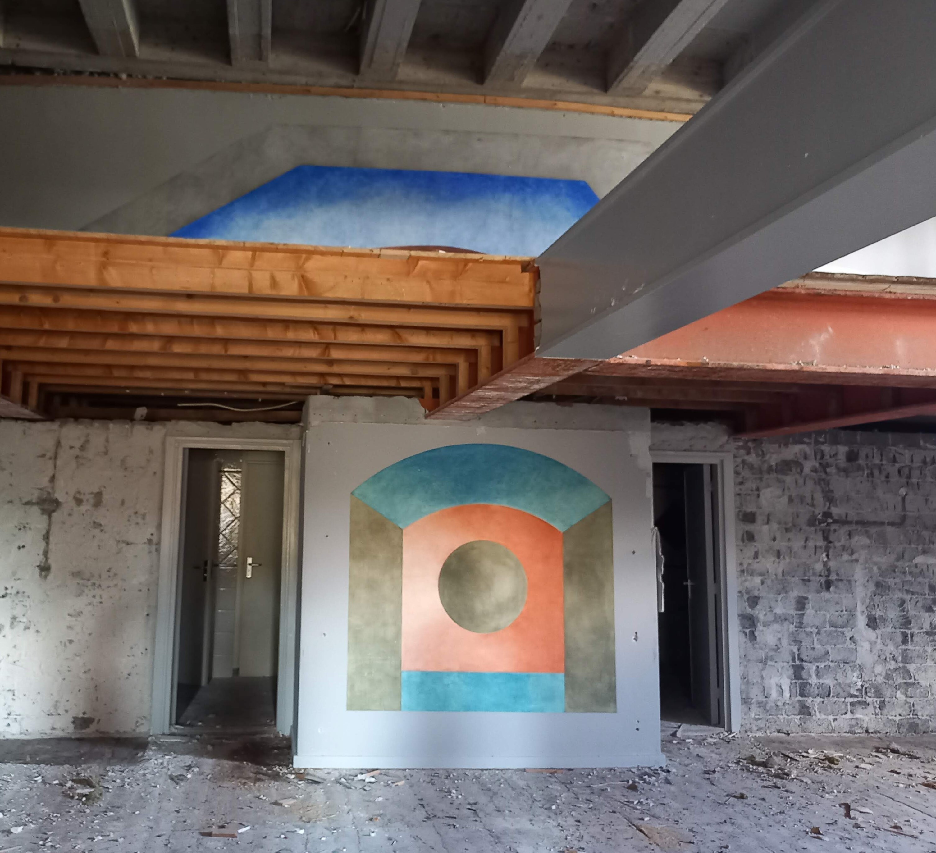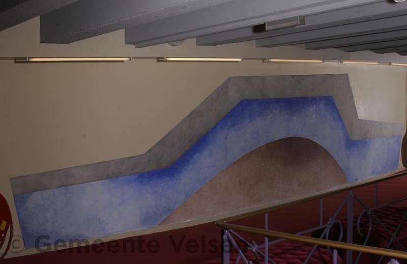 Het originele werk bestaat uit 3 wandschilderingen, verdeeld over 3 verdiepingen. De werken zijn niet geheel meer in originele staat; de “achterwand” is van kleur veranderd bij de herinrichting van het pand. Bij de verbouwing van het pand wordt bekeken of de werken in de nieuwbouw kunnen worden geintegreerd.