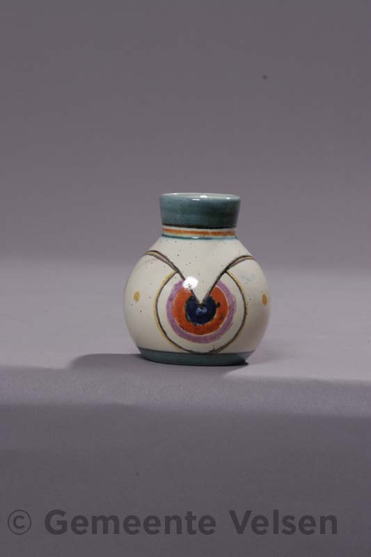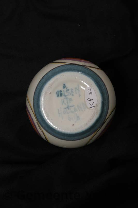 Vaasje met om de voet een groene band en om de hals een brede band opgebouwd uit groen, bruin, oranje en groen, met geometrische decoratie in oranje, paars, donker blauw op roomkleurige ondergrond. Gemerkt A Velsen KTP/Holland 61/B, periode 1924-1992.