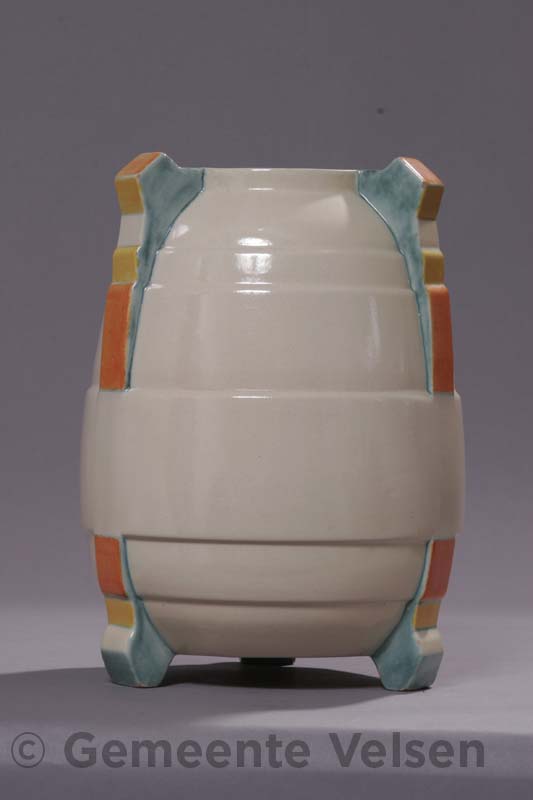 Vaas, roomkleurig geglazuurd, model 72. De 3 in reliƫf uitgevoerde voeten/hand-grepen gedecoreerd in oranje geel en groen. Ontwerp: E. Snel, gemerkt v.v. (J.G. van Vliet) Velsen kTp Holland 72/1. Ingekrast K en 72. Iets beschadigd. Periode ca. 1929.