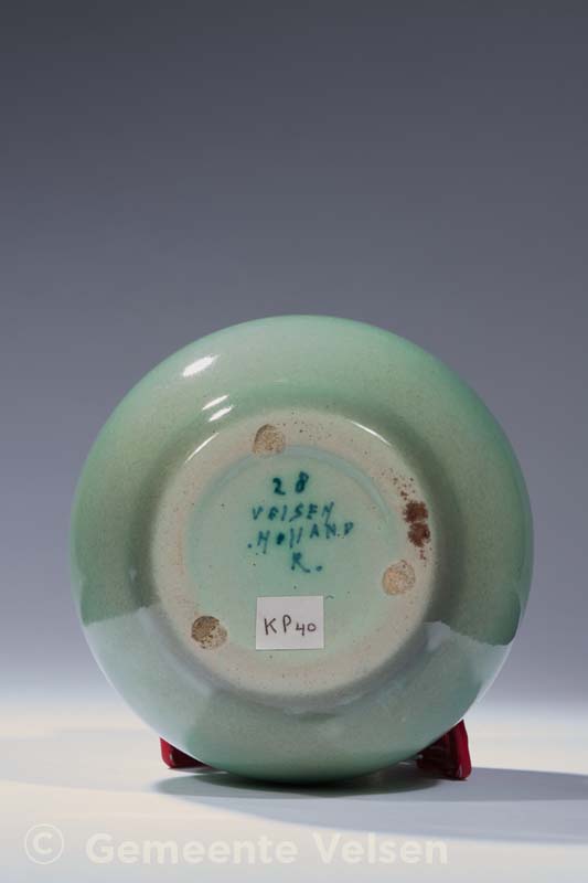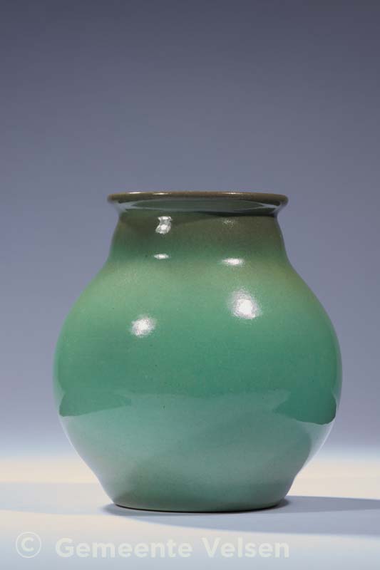 Vaas, groen glazuur, met grijze mond. Gemerkt: Velsen Holland R 28, periode 1936-1942.