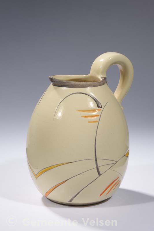 Aardewerk kan met gestileerd oor, in crème glazuur, met een lijnpatroon in geel, oranje en blauw.