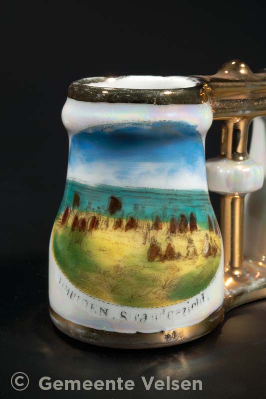 Porseleinen peper- en zoutstel, bestaande uit twee aan elkaar verbonden vaatjes met elk een losse deksel. Parelmoerdekking met gouden biezen. Op elk van de vaatjes een geschilderde afbeelding met tekst; links: IJmuiden strandgezicht, rechts: IJmuiden haveningang. Z.j. (ca.1910).