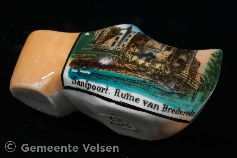 Porseleinen klompje, oranje met een afbeelding van de Rune van Brederode en met de tekst: Santpoort Ruïne van Brederode, z.j. (ca. 1925).