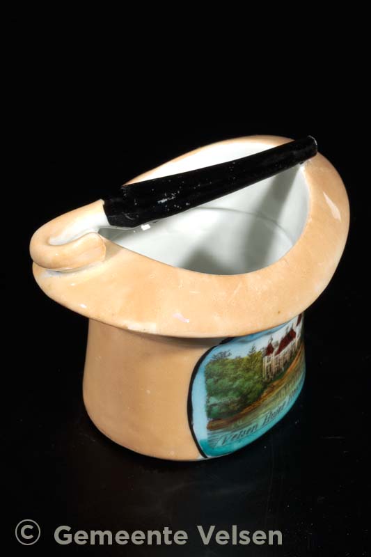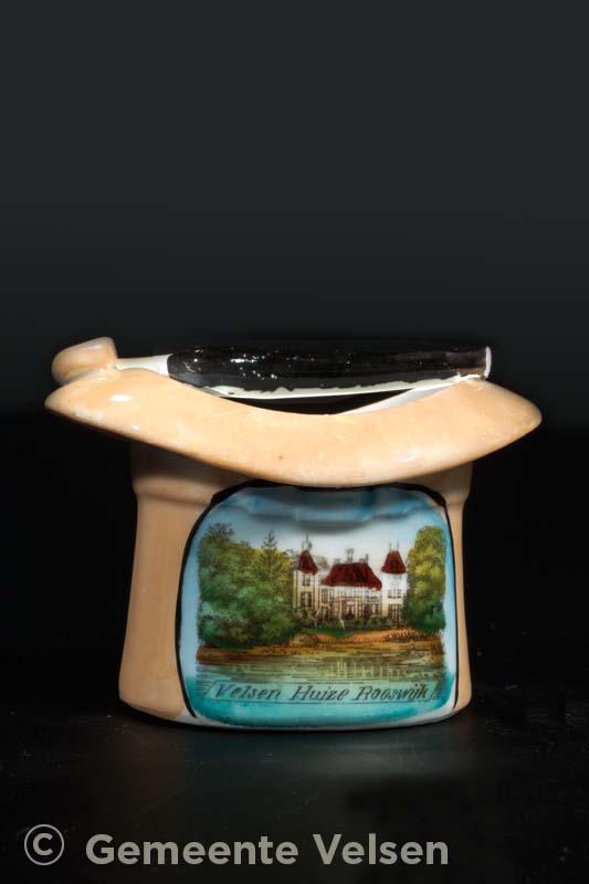 Porseleinen voorwerp in de vorm van een hoge hoed, beige, met daarop een afbeelding in diverse kleuren en de tekst: Velsen – Huize Rooswijk. Dwars over de hoge hoed ligt een zwarte paraplu.