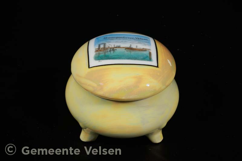Porseleinen rond bonbonschaaltje met deksel, geel, met op de deksel een afbeelding in diverse kleuren en de tekst: Stoompontveer Velsen.