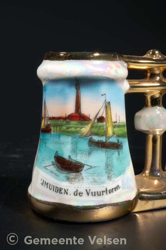 Porseleinen peper- en zoutstel bestaande uit twee aan elkaar verbonden vaatjes,  met elk een los deksel, parelmoer dekking met gouden biezen. Op elk van de vaatjes een afbeelding, links de vuurtoren en drie bootjes en de tekst: IJmuiden, de Vuurtoren en rechts het strand met de tekst: Forten bouwen, Groeten uit IJmuiden, z.j. (ca. 1910).