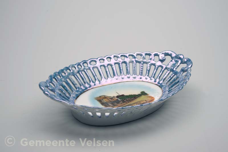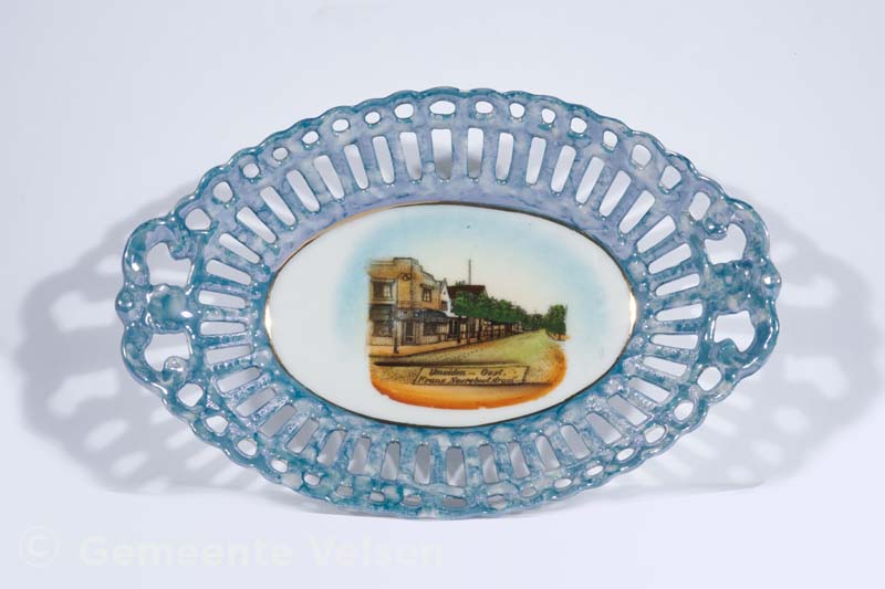 Een wit porseleinen schaaltje met een aan de bovenzijde blauwe, brede opengewerkte rand. Het heeft een ovale vorm. Op de bodem een afbeelding, in diverse kleuren, van een straat met bomen en de tekst: IJmuiden-Oost, Frans Naereboutstraat. Op de onderkant het merkteken Bavaria – Schumann.