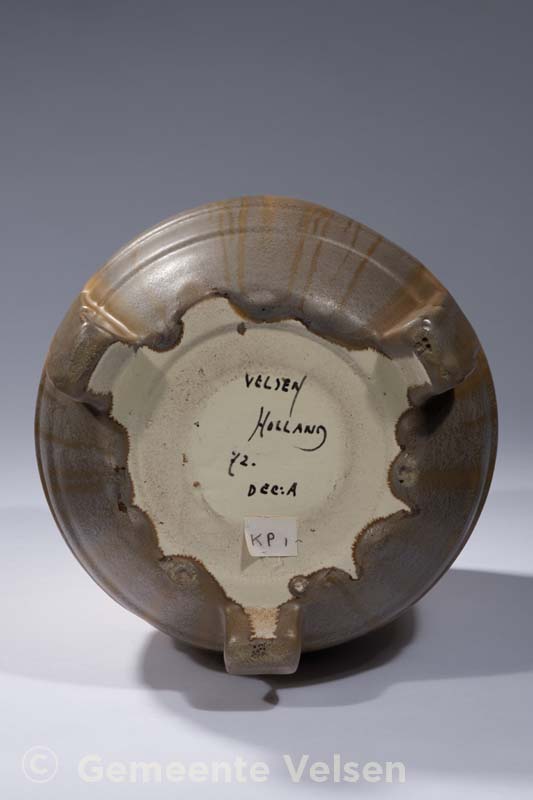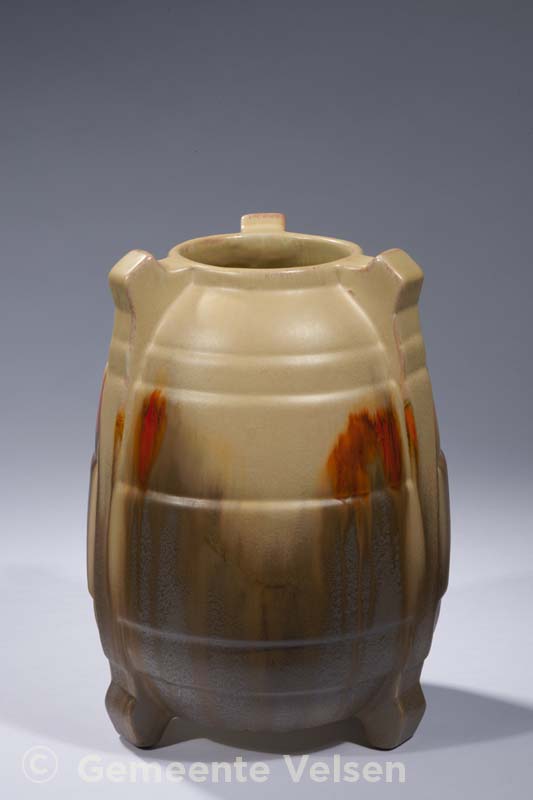 Vaas van aardewerk, staande op drie poten, uitgevoerd in de kleuren licht geel, oranje en grijs (spuitwerk met druipglazuur), hoog 26 cm. Gemerkt Velsen Holland, periode c. 1935 en later.