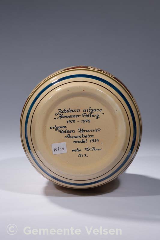Handbeschilderde vaas van Delfts aardewerk in de kleur beige, beschilderd in de kleuren blauw, groen, zwart, bruin en oker. Aan de onderzijde staat: Jubileumuitgave Kennemer Potterij 1919-1979. Uitgave Velsen Keramiek, Sassenheim model 1929, ontw. W. Pouw no.2. Certificaat van echtheid Keramiek Velsen uit Sassenheim nr. 200/2 bevindt zich in de vaas. Aangeboden aan wethouder H. Scheeper t.g.v. de opening van de tentoonstelling ‘de vier Paddenstoelen’ op 6 juni 1980.