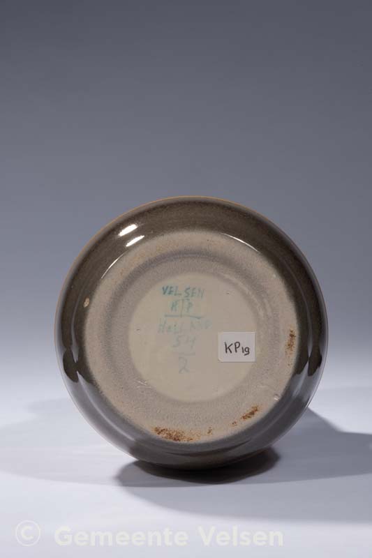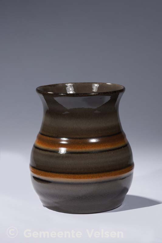 Geglazuurde aardewerk vaas, bij de hals iets geknepen met in reliƫf 2 banden in de kleuren zwart, oranje/bruin, beige/zwart op een ondergrond van afwisselend licht en donker grijs. Gemerkt Velsen kTp Holland 54/2, periode ca. 1930.