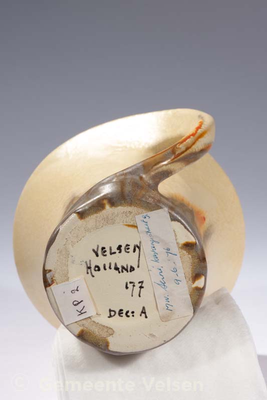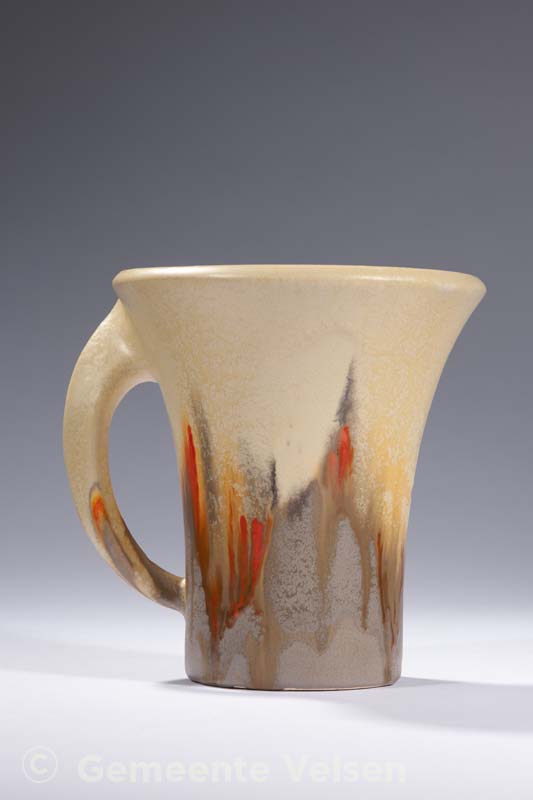 Vaas van aardewerk, uitgevoerd in de kleuren, zacht geel, oranje en grijs (spuitwerk met druipglazuur), hoog 14,5 cm. Gemerkt Velsen Holland, periode c. 1935 en later.